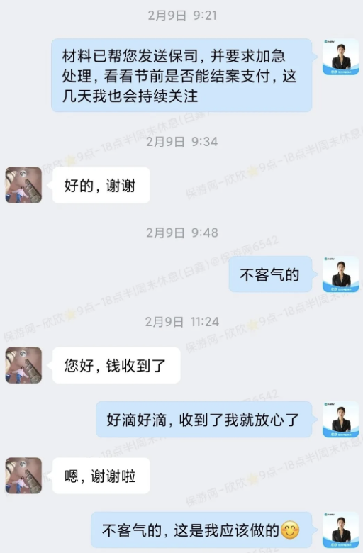 保游网接到报案后,第一时间安排理赔专员联系现场领队,告知注意事项,提醒收集材料。