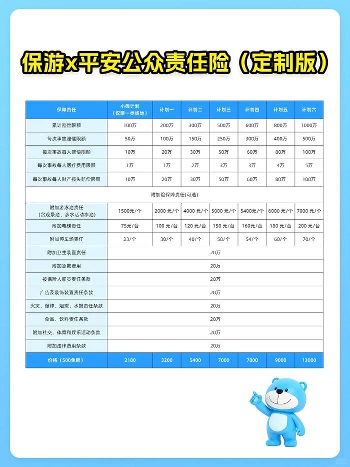 很多场馆老板只买了基础险,结果出事了才发现游泳池、电梯、停车场出事根本不管。这些都是需要额外勾选的“附加险”。